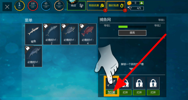 3、對捕魚網(wǎng)進行捕魚加速操作,提升捕魚網(wǎng)的捕獲魚的速度,增強其功能,能更高效地捕魚,獲取更多魚類資源。