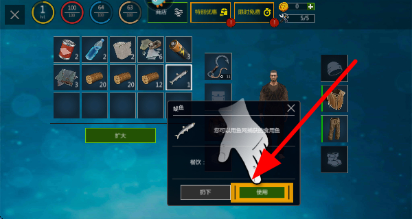 4、在物品欄中選擇捕獲的魚,點擊使用,可利用魚來恢復狀態(tài)或進行其他操作,保障生存需求。