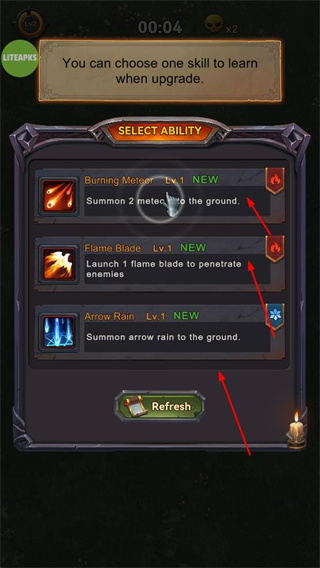 1、升級時可選擇學(xué)習(xí)技能,如燃燒隕石、火焰 blade、箭雨等,每種技能有不同的攻擊效果。