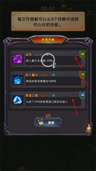 2、每次升級可從三個技能中選擇一個學(xué)習(xí),如詛咒、收入囊中、穿透之箭等。