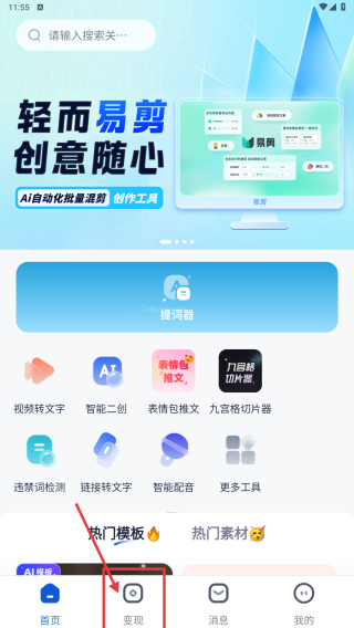 1、打開視頻創(chuàng)作類應用,點擊底部變現(xiàn)選項,進入變現(xiàn)功能頁面。