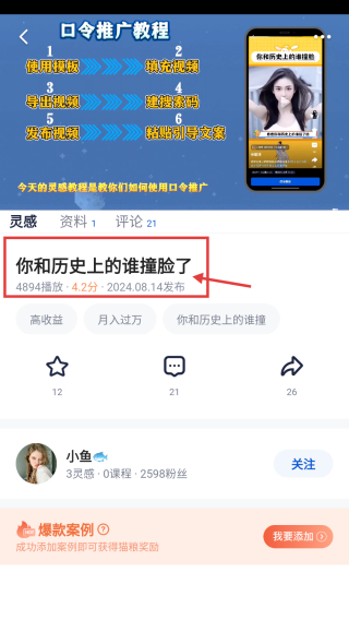 4、在教程詳情頁,查看口令推廣教程步驟及相關(guān)靈感內(nèi)容,學習視頻創(chuàng)作推廣技巧。