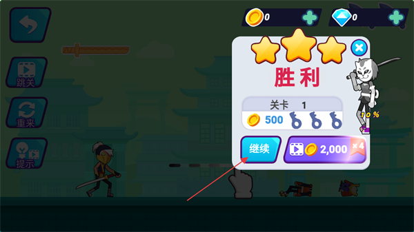 4、成功擊敗關卡內所有敵人后,點擊繼續(xù)按鈕,進入下一關。
