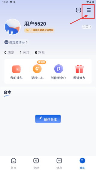 2、在個人中心頁面,點(diǎn)擊右上角菜單圖標(biāo),展開功能列表。