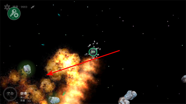 4、應(yīng)對爆炸區(qū)域,在太空場景中,注意避開爆炸區(qū)域,同時利用爆炸的機會,吞噬碎片。