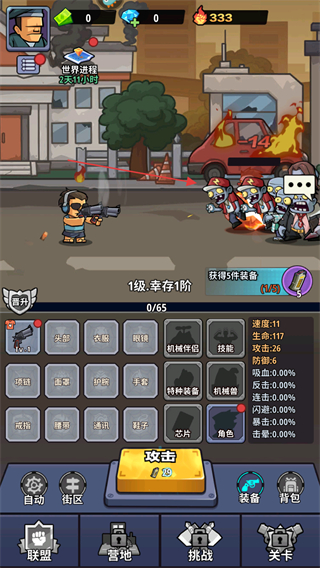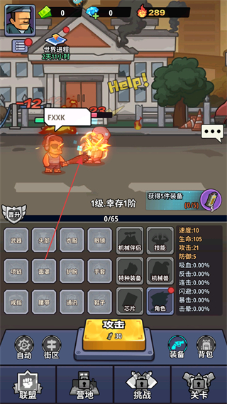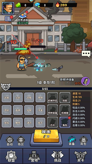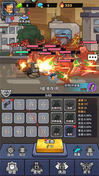 2、持續(xù)點(diǎn)擊攻擊按鈕,消滅敵人,獲取經(jīng)驗(yàn)和裝備,提升自身屬性。