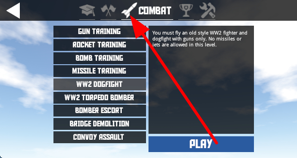 1、在戰(zhàn)斗訓(xùn)練界面,選擇不同的訓(xùn)練項(xiàng)目,比如槍械訓(xùn)練等,點(diǎn)擊PLAY,開始對(duì)應(yīng)的飛行訓(xùn)練任務(wù)。