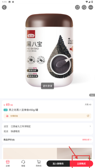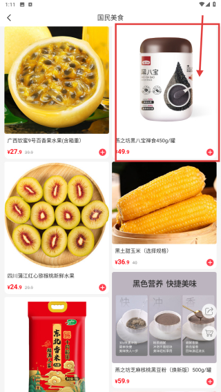 3、在商品列表中,點(diǎn)擊燕之坊黑八寶450g/罐商品條目,進(jìn)入商品詳情頁。