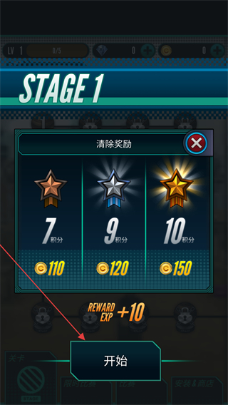 1、在關(guān)卡選擇界面,查看STAGE1的清除獎勵,點擊開始進入游戲。