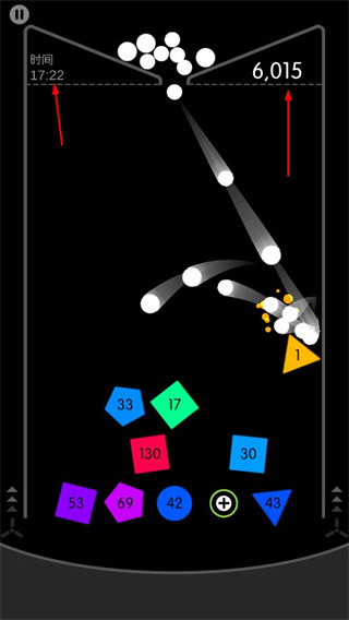 3、游戲中留意時間和分數(shù)變化,合理利用道具,提升彈球數(shù)量助力消除。