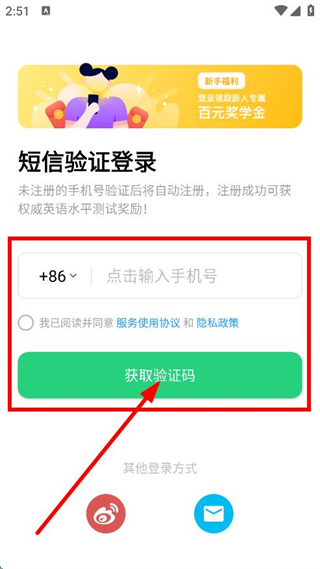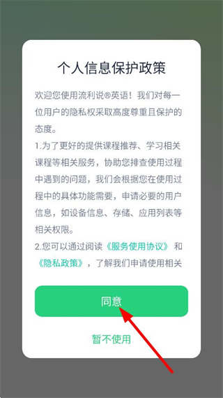 1、在流利說英語APP的個(gè)人信息保護(hù)政策彈窗中,點(diǎn)擊同意,隨后進(jìn)入登錄頁面。