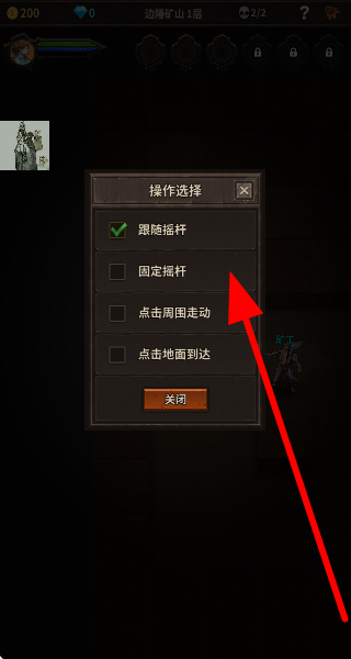 1、操作選擇界面,挑選跟隨搖桿、固定搖桿等不同操作模式,選好后關(guān)閉界面,開始地牢冒險(xiǎn)。