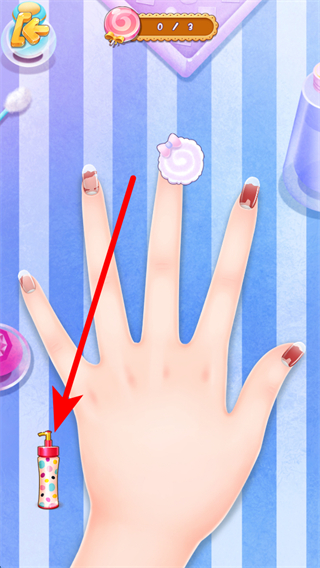 3、進行美甲時,先點擊帶有彩色波點的瓶子,給指甲做好基礎(chǔ)護理,之后能添加可愛裝飾,讓指甲變得精致漂亮,完成美甲步驟可推進進度。