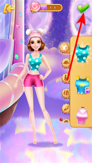2、服飾搭配環(huán)節(jié),從右側(cè)服飾欄挑選喜歡的上衣等服飾,選好后點擊右上角綠色對勾按鈕,確認當前的服飾搭配,逐步打造出心儀的穿搭風格。