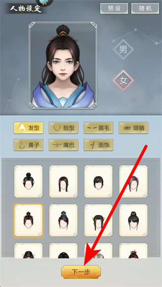 1、進入后可自定義人物形象,在發(fā)型、臉型等多個部位選擇喜歡的樣式,打造專屬角色,完成后點擊下一步,進入出身選擇環(huán)節(jié)。