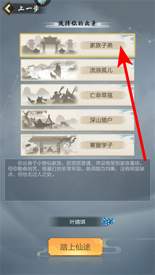 2、出身有家族子弟、流浪孤兒等多種選項,不同出身會帶來不同初始屬性與后續(xù)發(fā)展影響,選好后點擊踏上仙途,正式開啟修真。