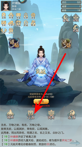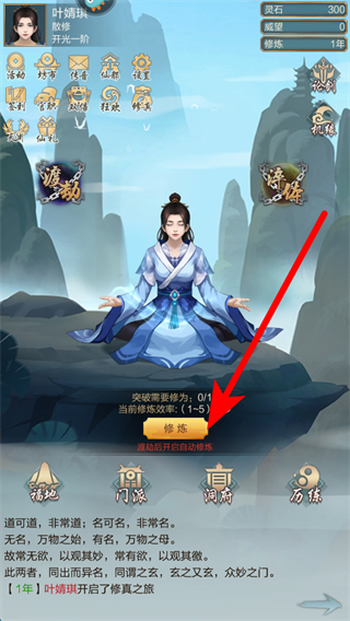 3、在修煉界面,可點擊修煉按鈕提升修為,隨著修為提升,能朝著開光等境界突破,突破需要滿足修為等條件,成功突破可解鎖新能力。