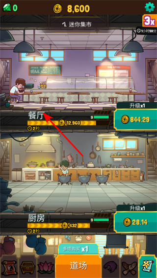 4、拓展經(jīng)營(yíng)設(shè)施,解鎖并升級(jí)餐廳廚房等經(jīng)營(yíng)設(shè)施,提升各區(qū)域的金幣收益,實(shí)現(xiàn)道場(chǎng)的規(guī)模經(jīng)營(yíng)。