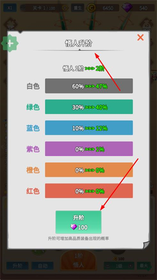2、在悟人升階界面,查看不同品質(zhì)升階的概率等信息,點擊升階按鈕,消耗對應(yīng)資源進(jìn)行升階操作。