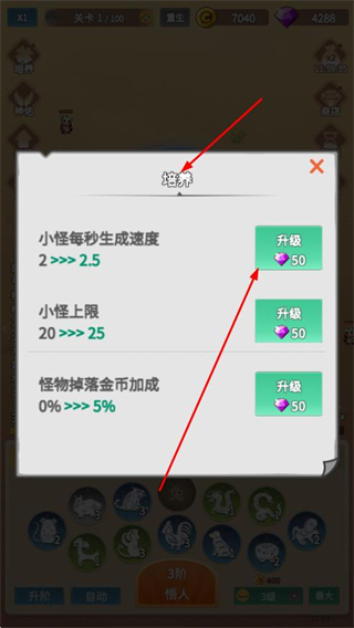 4、進(jìn)入培養(yǎng)界面,可消耗資源升級小怪生成速度、小怪上限、怪物掉落金幣加成等屬性,優(yōu)化游戲內(nèi)的成長與收益體驗。