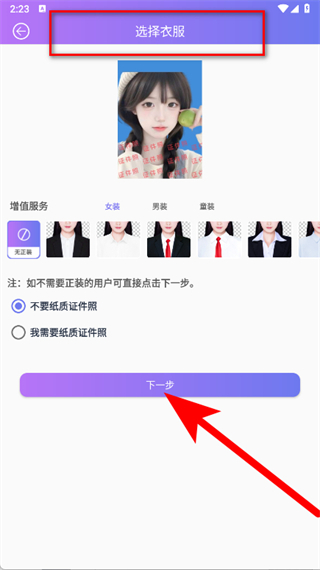 5、進入選擇衣服頁面,可選擇合適的服裝,完成證件照制作。