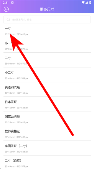 2、進入更多尺寸頁面,選擇所需的證件照尺寸。