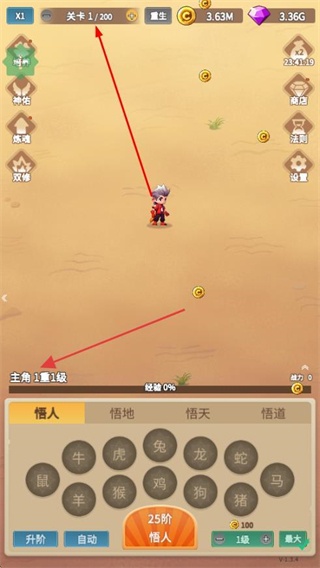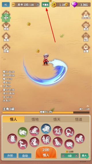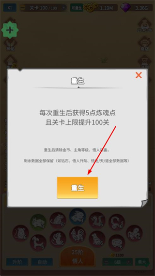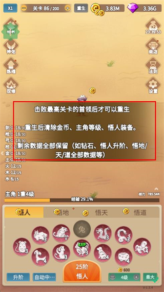 4、重生完成后,關(guān)卡會重置到第1關(guān),主角等級變?yōu)?重1級,經(jīng)驗(yàn)值清零,但鉆石、悟人升階等數(shù)據(jù)會保留。