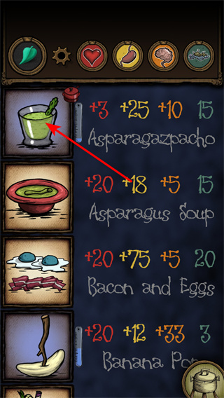 1、選擇料理配方,在料理列表中,挑選如Asparagazpacho料理,查看屬性加成,為料理確定目標(biāo)。