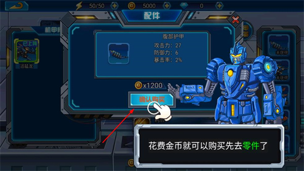 1、花費(fèi)金幣購買機(jī)甲配件,提升機(jī)甲恐龍的攻擊力、防御力等屬性,為戰(zhàn)斗奠定基礎(chǔ)。