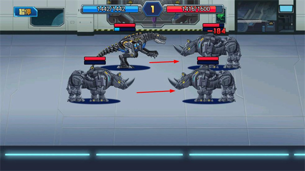 1、操控機(jī)甲恐龍與敵方機(jī)甲對(duì)戰(zhàn),通過(guò)攻擊削減敵方血量,爭(zhēng)取戰(zhàn)斗勝利。