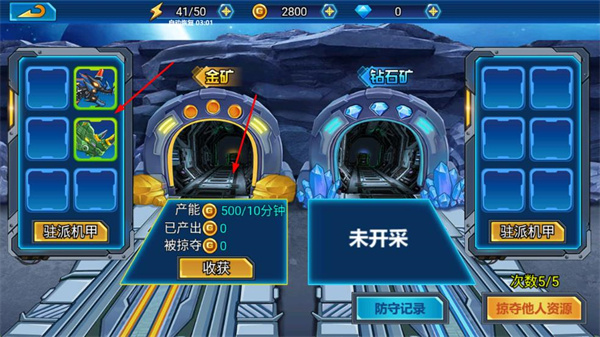 2、派遣機(jī)甲到金礦、鉆石礦開(kāi)采資源,收獲金幣、鉆石,為機(jī)甲養(yǎng)成提供資源支持。