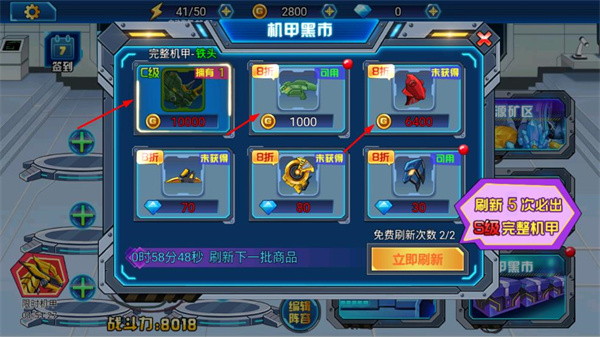 3、在機(jī)甲黑市購(gòu)買(mǎi)不同等級(jí)的完整機(jī)甲或部件,提升機(jī)甲戰(zhàn)力。