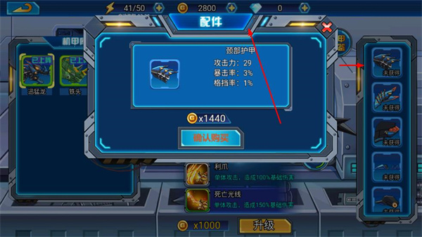 4、花費(fèi)金幣購(gòu)買(mǎi)配件,提升機(jī)甲的攻擊力、暴擊率等屬性,助力戰(zhàn)斗與資源開(kāi)采。