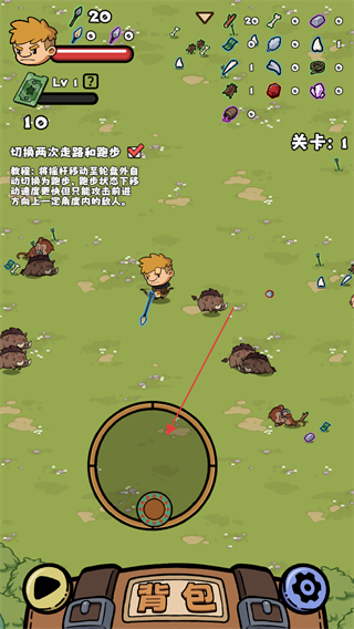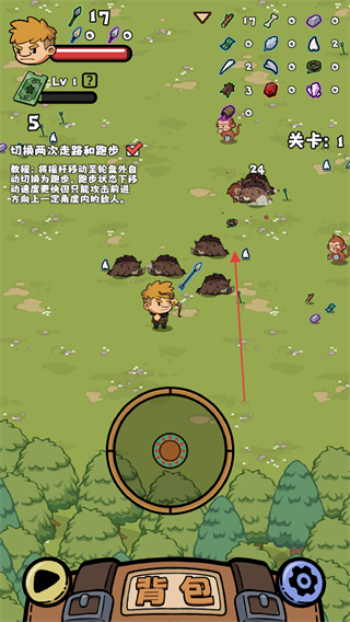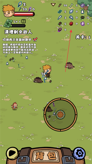 1、進入關卡1,通過屏幕下方的虛擬搖桿操控角色移動,靠近敵人進行攻擊。