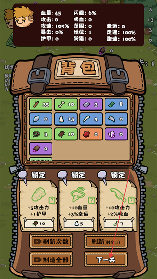 4、戰(zhàn)斗結束后,點擊背包,查看和使用道具提升屬性,再點擊下一關進入新關卡。