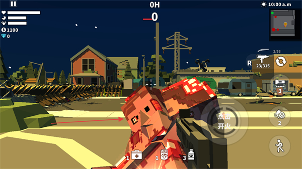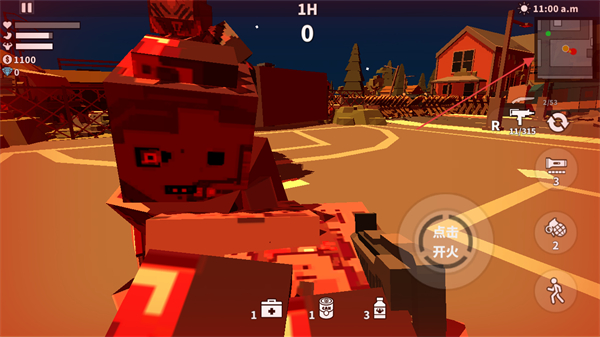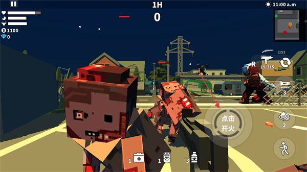 2、僵尸靠近時,點(diǎn)擊屏幕右側(cè)點(diǎn)擊開火按鈕射擊,留意子彈數(shù)量,及時躲避僵尸攻擊。