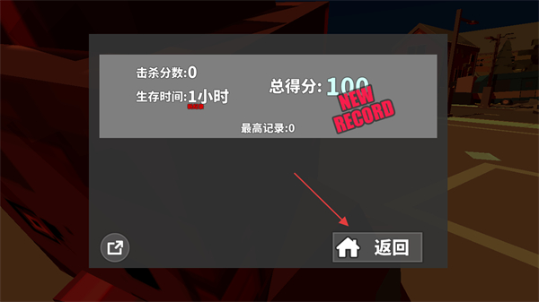 4、結(jié)束游戲后,查看擊殺分?jǐn)?shù),生存時間和總得分,點(diǎn)擊返回按鈕回到主界面。