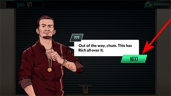 1、推進(jìn)劇情流程,點(diǎn)擊NEXT按鈕,跟隨劇情發(fā)展,了解倉庫拍賣的背景和規(guī)則。