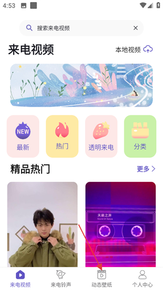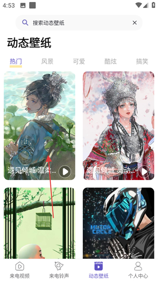 1、進入酷彩鈴,在首頁點擊底部動態(tài)壁紙,進入動態(tài)壁紙頁面。