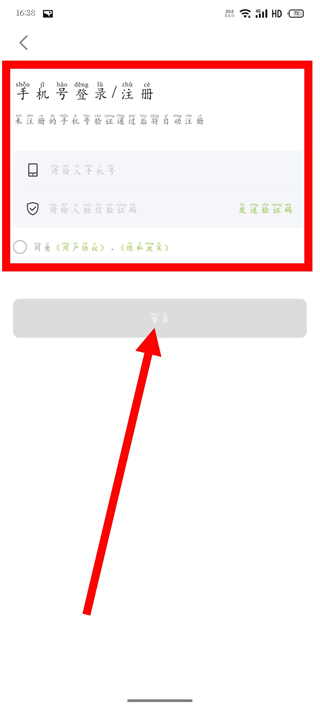 4、先輸入手機號碼,再點擊發(fā)送驗證碼,待收到驗證碼后填寫到對應(yīng)輸入框,勾選相關(guān)用戶協(xié)議,點擊登錄按鈕,完成注冊。
