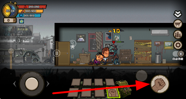 4、碰到僵尸等敵人時(shí),點(diǎn)擊攻擊按鈕,對(duì)敵人發(fā)起攻擊,擊敗敵人可獲取經(jīng)驗(yàn)或物品,保障自身生存。