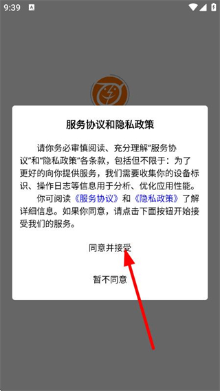 1、在服務(wù)協(xié)議和隱私政策彈窗中,點(diǎn)擊同意并接受,進(jìn)入首頁。