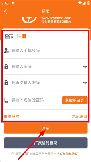4、輸入手機(jī)號碼、密碼、再次輸入密碼及短信驗(yàn)證碼后,點(diǎn)擊注冊,完成注冊操作。