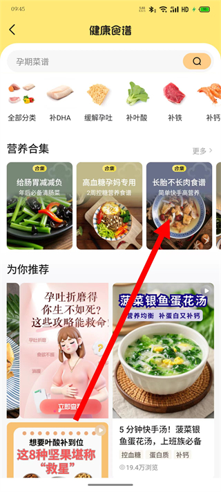 2、進(jìn)入健康食譜頁(yè)面后,選擇長(zhǎng)胎不長(zhǎng)肉食譜。