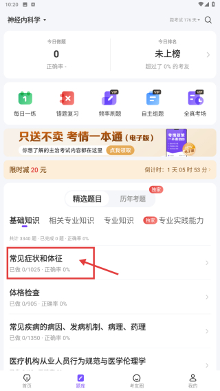 2、在題庫頁面,選擇常見癥狀和體征分類,瀏覽該分類下的知識點列表。