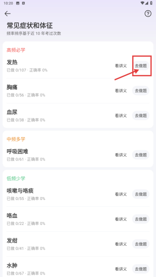 3、在知識點列表中,點擊目標知識點如發(fā)熱后的去做題按鈕,進入題目練習頁。