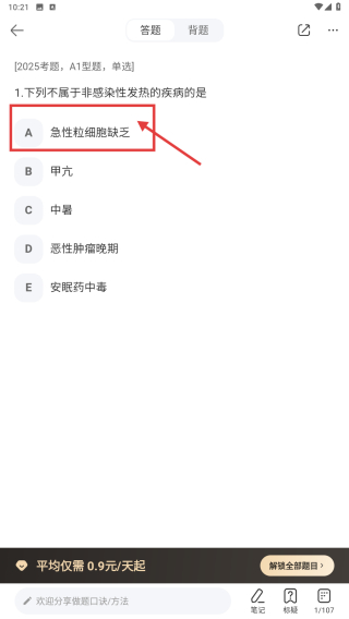 4、在題目練習頁,針對單選題如2025年題,選擇正確答案A急性粒細胞缺乏,完成習題練習操作。