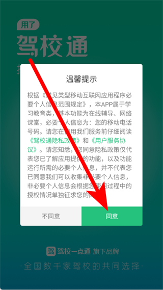 1、打開駕校通,在彈出的溫馨提示彈窗里點擊同意,進入主界面。