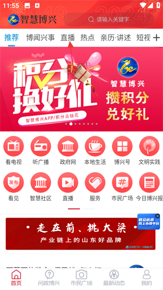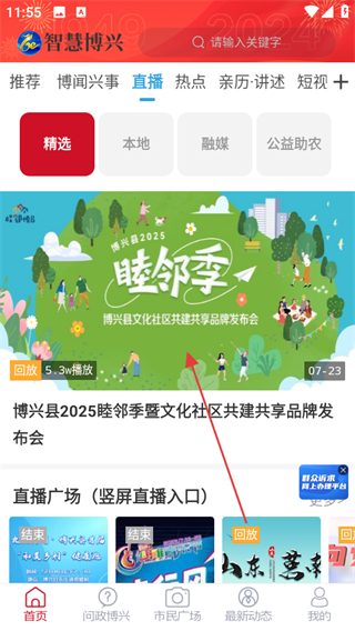 1、進(jìn)入智慧博興,在首頁點(diǎn)擊頂部直播,進(jìn)入直播頁面。