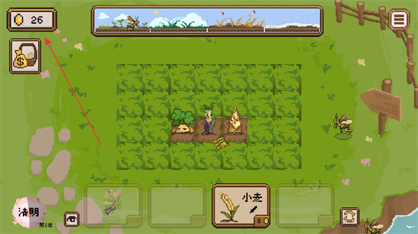 1、進入游戲,先查看左上角金幣數量,點擊田地中的方塊,使用鋤頭開墾土地。